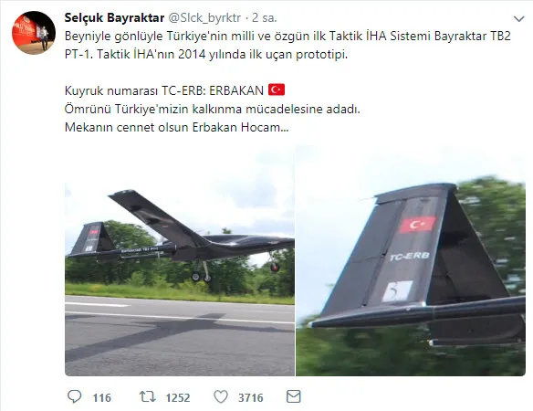 Kuyruk numarası 'TC-ERB: ERBAKAN TR' olan Türkiye'nin yerli ve milli ilk Taktik İHA Sistemi Bayraktar TB2 PT-1'in fotoğraflarını sosyal medya hesabından paylaştı.