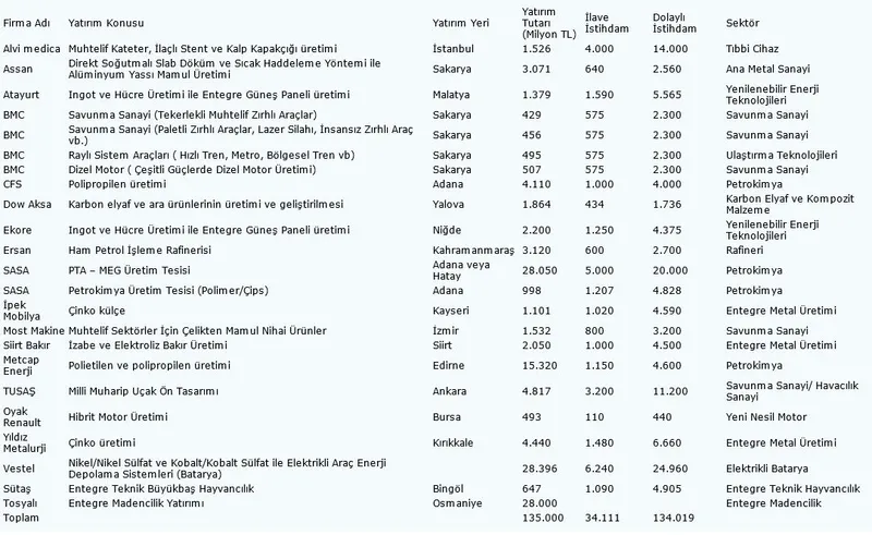 Stratejik nitelikleri ve teknolojik özellikleri dolayısıyla desteklenecek yenilenebilir enerji teknolojileri, metalürji yatırımları, ham petrol işleme rafinerisi, petrokimya ürünleri, karbon elyaf ve kompozit malzeme, tıbbi cihazlar ve sağlık teknolojileri, raylı sistem araçları, savunma sanayisi teknolojileri, motorlu taşıtlar-elektronik, tarım teknolojileri yatırımları projeleriyle yaklaşık 35 bin kişiye doğrudan, 134 bin kişiye dolaylı istihdam yaratılması bekleniyor.