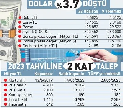 Recep Tayyip Erdoğan'ın ilk turda seçilmesi ve Cumhur İttifakı'nın Meclis'te çoğunluğu sağlamasının ardından olumlu ayrışmasını sürdüren borsada endeks 100 binin üstünü gördü. Hazine, dün gerçekleştirdiği üç ihalede borçlanmada zorlanmazken, iki kattan fazla taleple karşılaştı. Özellikle 2023 vadeli tahvile 9.1 milyar TL ile rekor teklif geldi. Bu kağıttaki net satış tutarı ise 4.7 milyar lira olarak gerçekleşti. 2028 vadeli tahvile de 7.4 milyar TL teklif geldi.