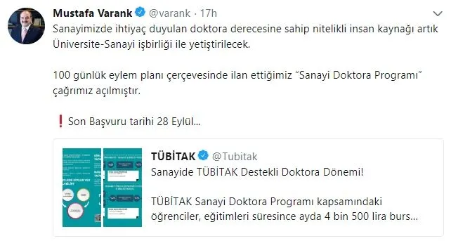 Mustafa Varank, Twitter hesabından yaptığı paylaşımda, sanayide ihtiyaç duyulan doktora derecesine sahip nitelikli insan kaynağının artık üniversite-sanayi işbirliğiyle yetiştirileceğini belirtti.