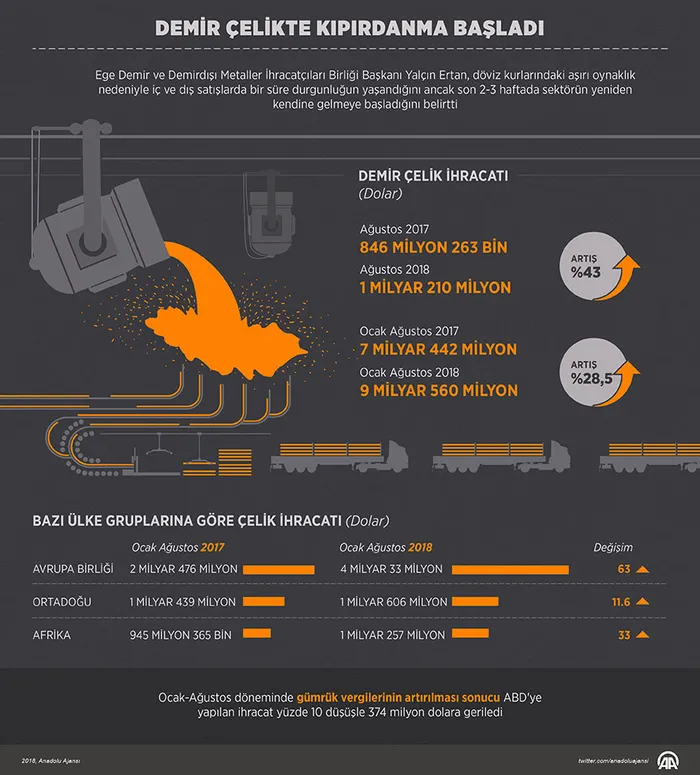 Ertan, Türk demir çelik ve alüminyum ürünleri için ilk olarak haziran ayında gümrük vergisi artırma kararı alan ABD'ye ihracatın artarak devam ettiğini ancak 13 Ağustos'ta alınan ikinci gümrük vergisi kararının satışları durma noktasına getirdiğini dile getirerek, şu bilgileri verdi: