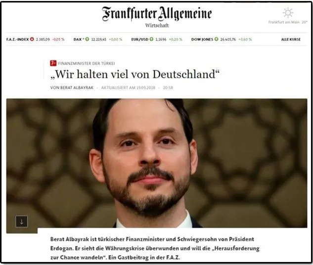 Hazine ve Maliye Bakanı Berat Albayrak Frankfurter Allgemeine Zeitung için kaleme aldığı makalede, Almanya ve Avrupa Birliği ile daha sıkı ekonomik işbirliği yapmak arzusunda olduklarını söyledi. Albayrak, Avrupa Birliği ile aralarındaki Gümrük Birliği'nin genişletilmesini ve himayecilikle mücadelede Berlin yönetimiyle işbirliği yapmak istediklerini dile getirdi. Maliye Bakanı Gümrük Birliği'nin sınai mamullerin yanı sıra hizmet ve tarım sektörlerini de kapsamasını amaçladıklarını belirtti.