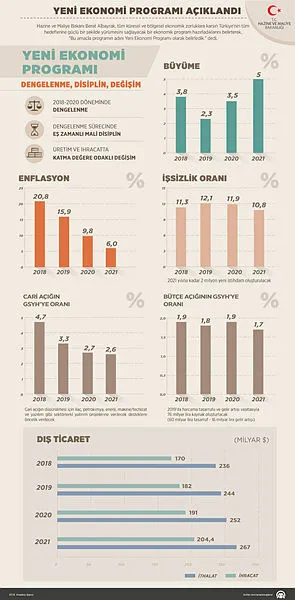 "Enflasyonla topyekün mücadele programı başlayacak. Enflasyonu yüzde 6'ya indireceğiz. Temel amacımız büyümeyi sağlam temeller üzerine kurmak. İhalesi başlamamış projeler askıya alınacak. İstihdam önemli başlıklarımızdan bir tanesidir. 2021'e kadar 2 milyon yeni istihdam oluşturacağız. Merkez Bankası elindeki tüm araçları kullanacak. 76 milyar TL tasarruf ve gelir artırıcı önlemler başlayacak. Kamu alacaklarına ilişkin yeni yapılandırma olmayacak . Yeni Ekonomi Programı (YEP) beş temel alandaki hedeflerimiz ve tedbirler üzerine kurguladık. Bu alanlar enflasyon, kamu maliyesi istihdam ve cari açık ile bankacılık ve reel sektör alanları oldu."