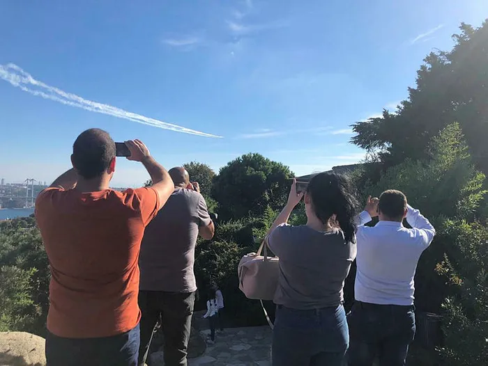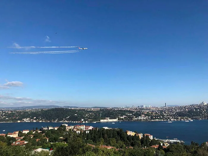 Daha sonra uçaklar, İstanbul Yeni Havalimanı'ndan ayrılarak gösteriye İstanbul Boğazı üzerinde devam etti. Saat 16.00 sıralarında boğaza giriş yapan uçaklar, bu kez İstanbul Boğazı'nı selamladı. Kol uçuşuna bir adet F16'da eşlik ederek, tarihi anların kamera kaydıyla görüntüledi.