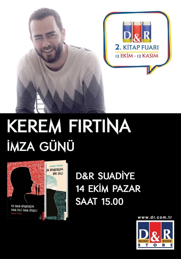"Kiralık Aşk", "Kurtlar Vadisi", "Fatmagül'ün Suçu Ne?", "Karadayı" gibi dizilerin sevilen oyuncusu Kerem Fırtına, "En Yakın Arkadaşım Daha Deli Daha Öfkeli" adlı ilk kitabı ile 14 Ekim Pazar günü D&R Suadiye' de olacak.