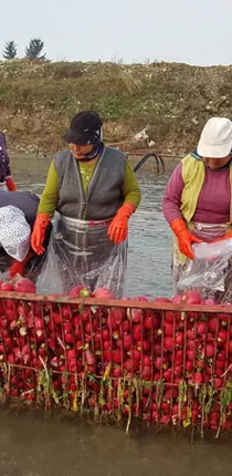 Çoğunluğunu kadınların oluşturduğu işçiler turpları tek tek yıkayarak paketleyip satışa hazır hale getiriyor. Kadınların torbaladığı turplar erkek işçiler tarafından kamyonlara yükleniyor.