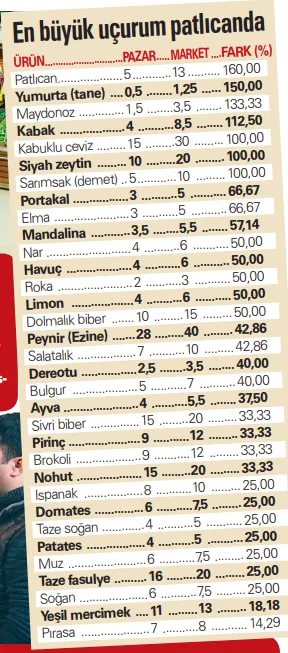 Akşam Gazetesi'nden Ufuk Korcan'ın haberine göre, Türkiye İstatistik Kurumu'nun (TÜİK) verilerine göre, kabağın kilosu ekimde 3.43 TL, kasımda 3.75 TL, aralıkta 5.13 TL olarak hesaplanmıştı. Yani kabak fiyatlarındaki 3 aylık artış marketlerde yüzde 150'ye dayandı. Yine pazarda kilosu 3 TL olan elmanın marketteki fiyatı en düşük 5 TL civarında. Marketteki fiyatlar sepet bazında pazara göre yüzde 50 daha yüksek olduğu görülüyor.