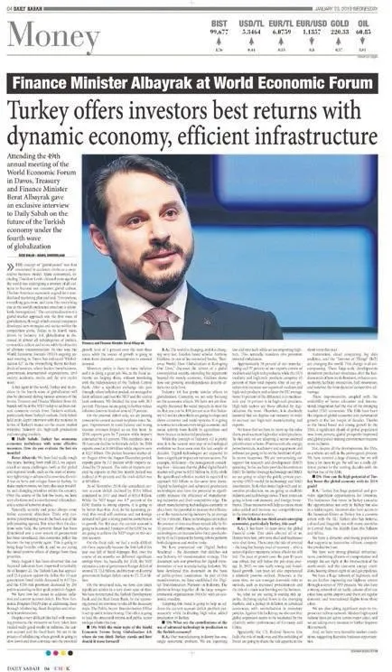 Turkuvaz Medya Grubu'nun yayın organı olan Daily Sabah'a da, Davos'ta özel bir makale yazan Hazine ve Maliye Bakanı Berat Albayrak, enflasyonu dizginlemek için para politikasının çok iyi iş çıkardığını belirterek, "Mali otorite olarak, Merkez Bankası'nın bağımsızlığına müdahale etmeden, onlara yardım ediyoruz" dedi. Bakan Albayrak, büyümenin yavaşlayacağı ve ardından önümüzdeki üç yıl içinde yeniden yüzde 5'lik potansiyel büyüme seviyesine yakınlaşacağı bir süreçte olduğumuzu belirterek, "Büyüme kaynağı iç tüketimden dış talebe dönecek" diye konuştu.