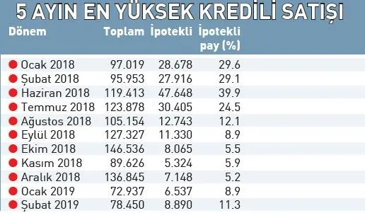 2018 yılının aralık ayında yüzde 5.2'ye kadar gerileyen ipotekli konut satışlarının toplam satışlar içerisindeki payı 2019'un ocak ayında yüzde 8.9'a çıktıktan sonra, şubatta yüzde 11.3 seviyesine yükseldi. Böylece, ipotekli satışların payında imi ayda 2 kattan fazla artış sağlanmış oldu.