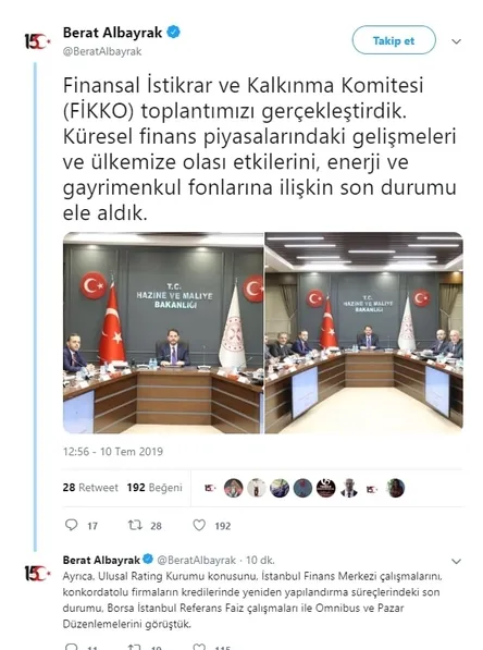 Hazine ve Maliye Bakanı Berat Albayrak, Finansal İstikrar ve Kalkınma Komitesinin (FİKKO) bugün toplandığını belirterek, "Toplantıda, küresel finans piyasalarındaki gelişmeleri ve ülkemize olası etkilerini, enerji ve gayrimenkul fonlarına ilişkin son durumu ele aldık." ifadesini kullandı.