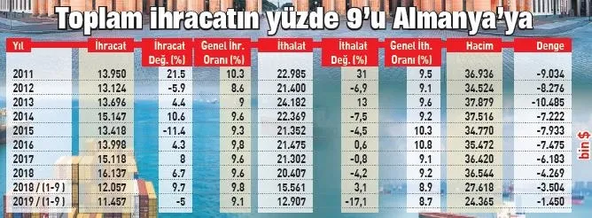 2015 yılında küresel ekonomik gelişmeler ve talep gerilemesi nedeniyle Türkiye'nin ihracatı 2014'e kıyasla yüzde 11.4 azalarak 13 milyar dolar olarak gerçekleşti. Ancak 2018 yılı dış ticaret verilerine göre Almanya'ya ihracat yüzde 6.8 artarak 16 milyar doların üzerine çıktı. En büyük ticari ortağımız olan Almanya ile ikili ticaretimiz, bazı yıllar hariç açık veriyor. 2018 yılı verilerine göre Almanya ile dış ticaret açığımız yaklaşık 4.3 milyar dolar olarak gerçekleşti. Almanya'ya ihracatımız yüzde 90 oranında sanayi ürünlerinden, geri kalan yüzde 10'luk oranın büyük kısmı da tarım ve gıda ürünlerinden oluştu.