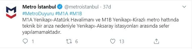 Öte yandan Metro İstanbul'dan yapılan açıklamada, " M1AYenikapı-Atatürk Havalimanı ve M1B Yenikapı-Kirazlı metro hattında teknik bir arıza nedeniyle Yenikapı-Aksaray istasyonları arasında sefer yapılamamaktadır. Sefer yapılamayan Yenikapı-Aksaray istasyonları arasında İETT otobüsleri ile ring seferi yapılmaktadır." denildi.