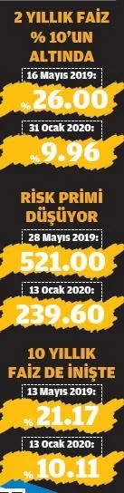 Ağustos 2018'deki kur saldırısının ardından 16 Mayıs 2019'da yüzde 26'ya yükselen 2 yıllık tahvilin faizi, Türk Lirası varlıklara ilginin artması ve Merkez Bankası'nın faiz indirimini sürdüreceği beklentileri ile dün yüzde 9.96 ile 10 Kasım 2016'dan bu yana ilk kez tek haneyi gördü. Mayıs 2019'da yüzde 21 olan 10 yıllık tahvilin faizi ise yüzde 10.09 ile 28 Ekim 2016'dan bu yana en düşük seviyeye indi. Türkiye'nin risk primini gösteren ve ekim ayında 410 puanı aşan 5 yıllık CDS'ler 240 puanın altına düştü. Tahvil faizlerindeki gerilemede CDS'in son 1.5 yılda 523 puandan 236 puana kadar gerilemesi de etkili oldu.