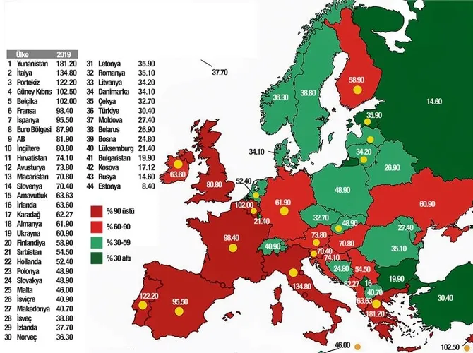 Türkiye 2019 verilerine göre, yüzde 30.4'lük borcun GSYH'ye oranı ile Avrupa ülkeleri arasında 36'ncı sırada yer aldı. Avrupa'nın en borçlu ülkesi yüzde 181 ile Yunanistan olurken, İtalya yüzde 134 ile ikinci sırada. Portekiz ise yüzde 122 ile Avrupa'nın en sağlıksız borçlu olan ülkelerinden... Portekiz, listenin üçüncü sırasında yer alıyor.
