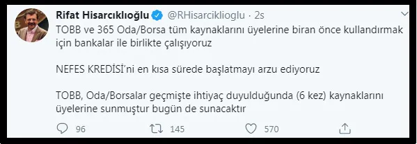 Üyelerin tepkisi ve baskısı artınca TOBB Başkanı Rifat Hisarcıklıoğlu, açıklama yapmak zorunda kaldı. Sosyal medya hesabından yaptığı açıklamada, kısa süre içinde nefes kredisi başlatmak istediklerini, TOBB ve 365 oda borsanın tüm kaynaklarını üyelerine bir an önce kullandırmak için bankalarla birlikte çalıştıklarını söyledi.