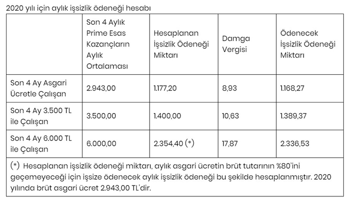 İŞKUR tarafından işsiz vatandaşlara maddi destek amacıyla sağlanan bu ücret her yıl asgari maaşa göre belirlenmektedir. 2020 yılında asgari maaş tutarının belirlenmesi ile beraber bu ödeneğin miktarı; son dört ay asgari ücretle çalışan vatandaşlar için bin 168 lira olurken aşağıda yer alan tabloda diğer maaş tutarlarına göre verilen ücreti inceleyebilirsiniz…