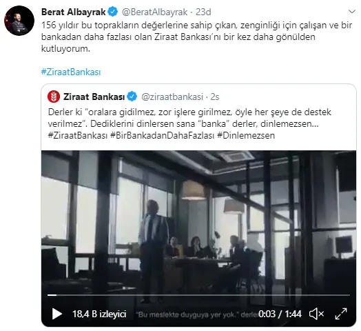 Bakan Albayrak, Twitter hesabından yaptığı paylaşımda, "156 yıldır bu toprakların değerlerine sahip çıkan, zenginliği için çalışan ve bir bankadan daha fazlası olan Ziraat Bankası'nı bir kez daha gönülden kutluyorum" ifadelerine yer verdi.