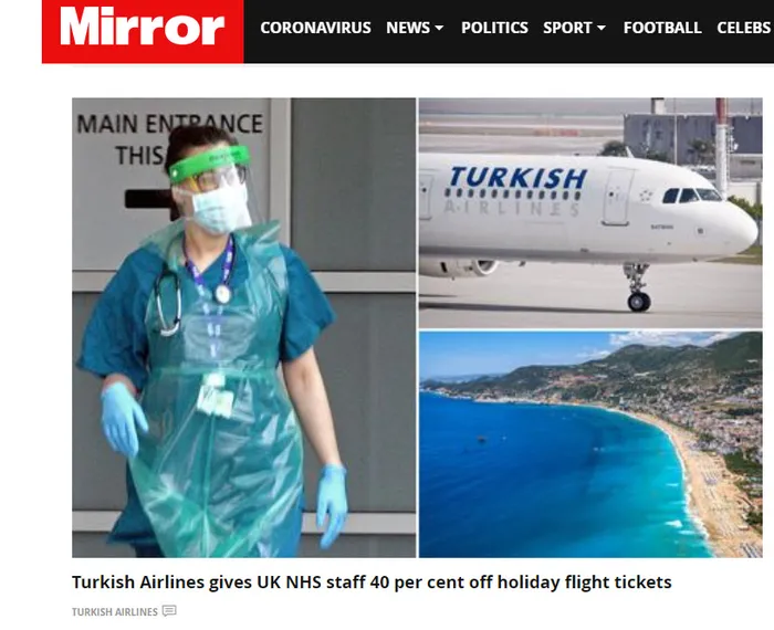 İngiliz medyasından The Mirror, söz konusu kampanyayı, "İnanılmaz cömert teklif, ailelerinde NHS çalışanları olan ve bu yaz Türkiye'ye gitmeyi umut eden milyonlarca İngiliz için iyi bir haber.THY'den yüz güldüren haber geldi" başlıklarıyla duyurdu. Öte yandan, Türk Hava Yolları (THY), yeni tip koronavirüs (Kovid-10) salgınıyla büyük bir özveri ile mücadele eden sağlık çalışanlarını yüzde 40 indirimli uçuracağı duyurulmuştu. THY Basın Müşavirliğinden yapılan açıklamaya göre, sağlık çalışanlarına özel bir kampanya başlatıldı. Bu kampanya ile dünyanın dört bir yanında görevli tüm sağlık çalışanları, THY internet sayfasından ve mobil uygulamasından düzenleyecekleri biletlerle yüzde 40 indirimli seyahat edebilecek.