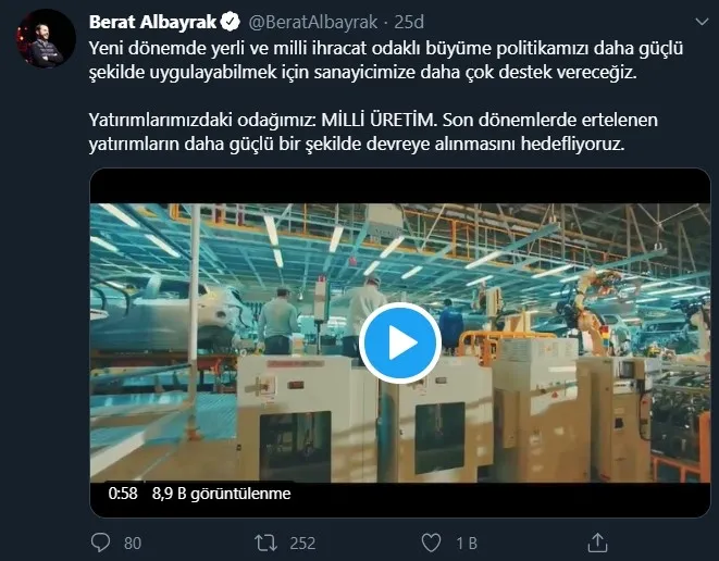 Türkiye Cumhuriyeti Hazine ve Maliye Bakanı Berat Albayrak, sosyal paylaşım sitesi Twitter'dan yayınladığı mesajında yerli ve milli ihracat odaklı büyüme politikasına vurgu yaparak, sanayicilere destek açıklaması yaptı.