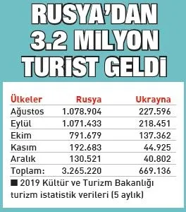 Rus turist yoğunluğunun ağustosta başlayacağını belirten turizmciler, sezonun ekim-kasıma uzayacağını vurguluyor. Bir aksilik oluşmaması durumunda, önümüzdeki 5 aylık dönemde geçen yılın aynı döneminde gelen Rus turist sayısının yakalanacağını aktaran tur operatörleri, "Bu rakamları yakalayabilmemiz için açılacak otel sayısı önemli" diyor. Turizm Bakanlığı'nın verilerine göre, 2019 Ağustos-Aralık aylarında Rusya'dan 3 milyon 265 bin turist gelmişti.