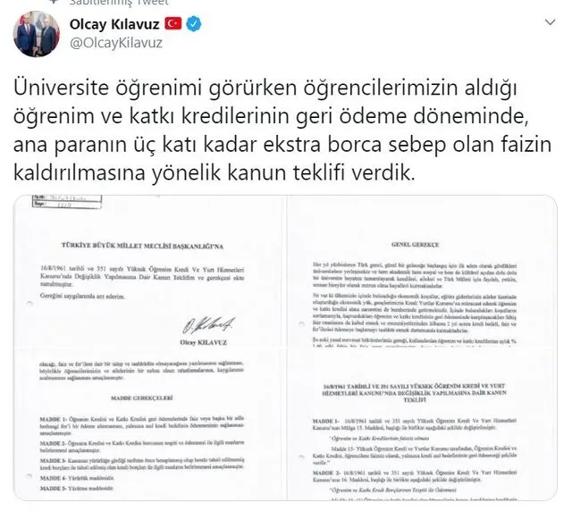 MHP Mersin Milletvekili Kılavuz'un Twitter'dan yaptığı açıklama; "Üniversite öğrenimi görürken öğrencilerimizin aldığı öğrenim ve katkı kredilerinin geri ödeme döneminde, ana paranın üç katı kadar ekstra borca sebep olan faizin kaldırılmasına yönelik kanun teklifi verdik." açıklamasını yaptığı görülürken, teklifin gerekçeleri ve maddeleri de sosyal medya hesabından paylaşıldı.