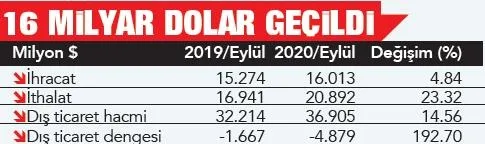 Koranvirüsün ekonomiye etkilerini alınan önlemlerle en aza indirip üçüncü çeyrekte tekrar büyümeye başlayan Türkiye, ihracatta da rekor kırıyor. Eylül ayı ihracatı 2019'un aynı dönemine göre yüzde 28.5, ağustosa göre ise yüzde 28.5 artarak 16 milyar doları aştı. Cumhuriyet tarihinin en yüksek eylül ayı ihracat rakamına imza atılırken, aynı zamanda 2020'nin de aylık bazda en yüksek seviyesine ulaşıldı. 207 ülkeye ihracat gerçekleştirilirken, 119 ülkeye ihracat artışı sağlandı.