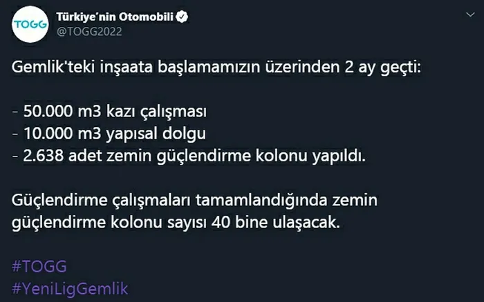 Türkiye'nin yüksek teknolojili ilk yerli otomobilinin üretileceği fabrikanın temeli, 18 Temmuz'da Bursa'nın Gemlik ilçesinde Cumhurbaşkanı Recep Tayyip Erdoğan'ın katılımıyla atılırken, çalışmalar tüm hızıyla devam ediyor. TOGG'un geçen ay sosyal medya hesabından yaptığı "Gemlik'teki inşaata başlamamızın üzerinden 2 ay geçti. 50.000 metreküp kazı çalışması, 10.000 metreküp yapısal dolgu, 2.638 adet zemin güçlendirme kolonu yapıldı. Güçlendirme çalışmaları tamamlandığında zemin güçlendirme kolonu sayısı 40 bine ulaşacak" duyurunun ardından, fabrikanın inşaatında her geçen gün aşamalar kaydediliyor.
