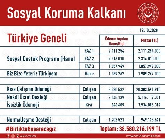 Bakan Selçuk sosyal medya hesabından yaptığı açıklamada, "Sosyal Koruma Kalkanı kapsamında vatandaşlarımıza sağladığımız destek ve yardımlarda 39 milyar TL'ye yaklaştık." dedi.