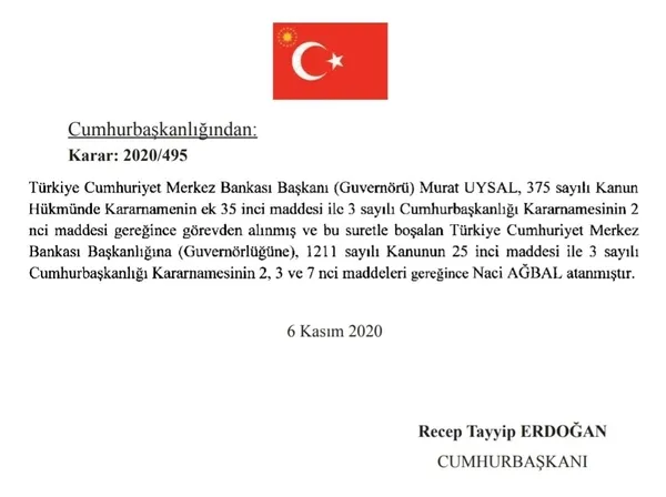 Merkez Bankası Başkanı Murat Uysal görevden alınarak yerine eski Maliye Bakanı Naci Ağbal atandı.