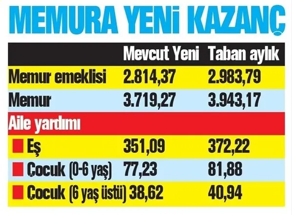 6 yaş altı 2 çocuğu olan, eşi çalışmayan memur aylık 505,55 lira alıyorken, bu tutar 535,98 liraya ulaşacak.