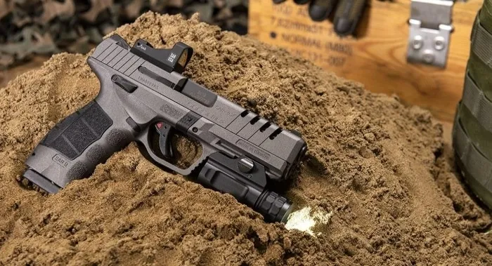 Yine tetik emniyeti özelliği ile tetik çekilmedikçe iğneyi bloke ederek silahın ateş almasını engelleyen SAR 9X, kırmızı nokta tetik göstergesi ile mekanizmanın kurulu olduğunu da gösteriyor.
