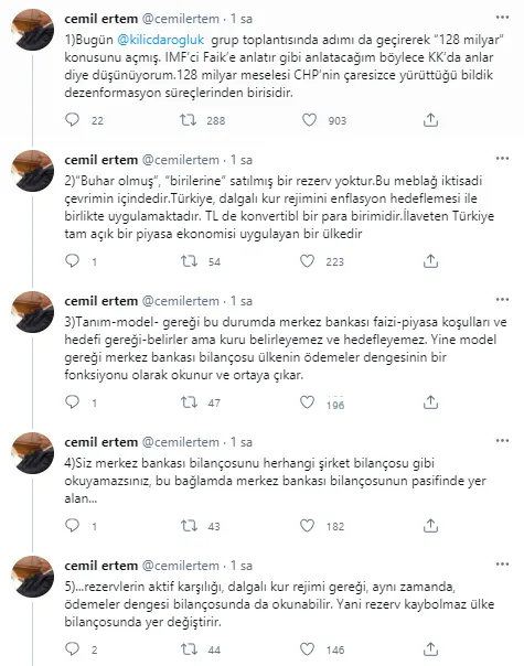 CHP Genel Başkanı Kemal Kılıçdaroğlu, partisinin grup toplantısında "128 milyar dolar nerede?" şeklindeki kirli provokasyonu sürdürmeye devam etti, Cumhurbaşkanı Başdanışmanı Cemil Ertem'i hedef aldı. Ertem, Twitter hesabından yaptığı paylaşımda, Kılıçdaroğlu'nun "128 milyar dolar buhar oldu" yalanını madde madde çürüttü.