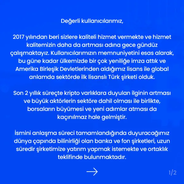 Son 2 yıllık süreçte kripto varlıklara duyulan ilginin artması ve büyük aktörlerin; sektöre dahil olması ile birlikte, borsaların büyümesi ve yeni adımlar atması da kaçınılmaz hale gelmiştir. İsmini anlaşma süreci tamamlandığında duyuracağımız; dünya çapında bilinirliği olan banka ve fon şirketleri; uzun süredir şirketimize yatırım yapmak istemekte ve ortaklık teklifinde bulunmaktadır.