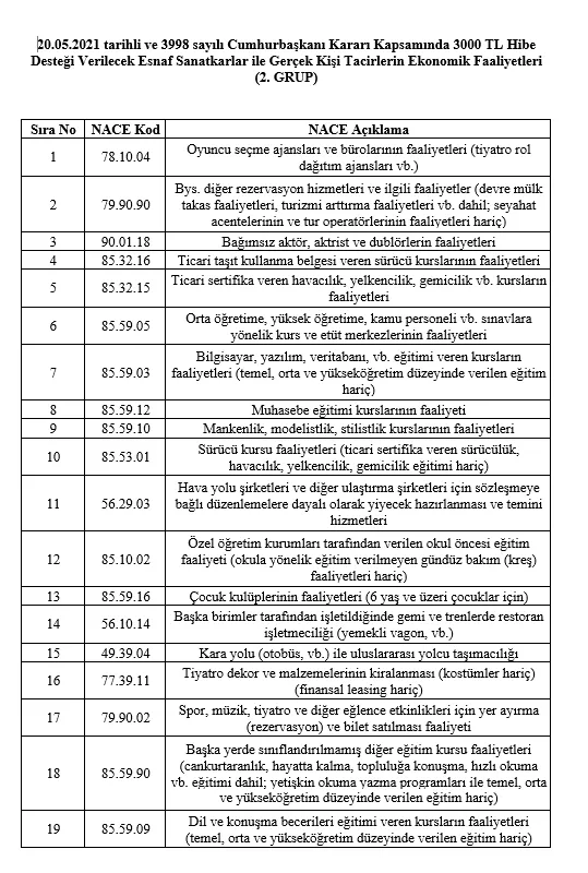 Söz konusu kararlar doğrultusunda 3 bin lira hibeyle desteklenecek ikinci grupta da aralarında pizzacı, çeşitli eğitim kursları, çocuk kulüpleri, canlı tiyatro, opera, bale, müzikal, konser gibi yapımların sahnelenmesi, deniz ve kıyı sularında diğer yolcu taşımacılığı, reklamcılık ile ilgili fotoğrafçılık, dövme ve piercing hizmetleri, kuru temizleme hizmetleri, çilingirlik, güzellik salonları, pastaneler, tarihi alanlar ve yapılar ile benzeri turistik yerlerin işletilmesi gibi işletmelerin bulunduğu 304 ekonomik faaliyet bulunuyor.