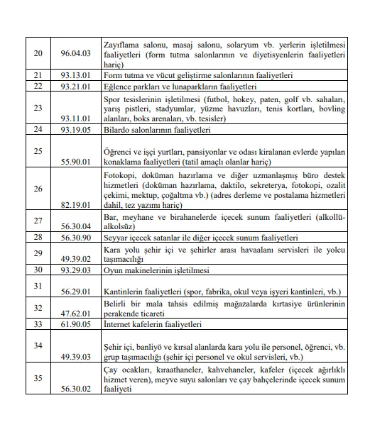 Tez, yazım büroları, dans pistleri, diskotekler, nikah salonları, kaplıca, spa merkezleri, atış poligonları, gazino, gece kulübü, taverna, diskotek, sinemalar, düğün, balo ve kokteyl salonlarının işletilmesi, plaj alanlarının işletilmesi, fayton ve bisikletle yolcu taşımacılığı, hamam, sauna gibi yerlerin faaliyetleri, zayıflama salonu, masaj salonu, solaryum gibi yerler, form tutma ve vücut geliştirme salonlarının faaliyetleri, eğlence parkları, spor tesislerinin işletilmesi, bilardo salonlarının faaliyetleri, öğrenci ve işçi yurtları, pansiyonlar ve odası kiralanan evlerde yapılan konaklama faaliyetleri, büro destek hizmetleri, bar, meyhane ve birahanelerde içecek sunum faaliyetleri vb.