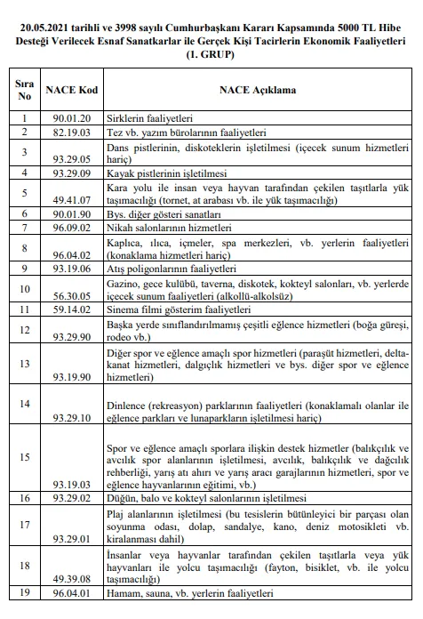 Bu kapsamda, 5 bin lira ile desteklenecek birinci grupta aralarında kayak pistlerinin işletilmesi, sirkler, gösteri sanatları, nikah ve düğün salonu işletmecileri, kaplıca, SPA merkezleri, sinema filmi gösterimi, spor ve eğlence amaçlı spor hizmetleri, plaj alanlarının işletilmesi, eğlence parkları, öğrenci ve işçi yurtları, pansiyonları, kara yolu şehir içi ve şehirler arası havaalanı servisleri ile yolcu taşımacılığı, kantinler, kırtasiye ürünlerinin perakende ticareti, internet kafelerin faaliyetleri, şehir içi personel ve okul servisleri, çay ocakları, kıraathaneler, kahvehaneler, kafeler gibi işletmelerin bulunduğu 35 ekonomik faaliyet yer alıyor.