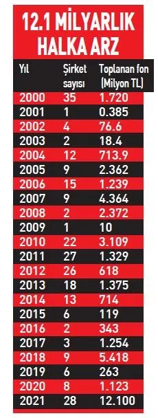 28 ŞİRKET BU YIL HALKA AÇILDI Bu yıl 24 şirket 11.6 milyar lira büyüklüğünde halka arz gerçekleştirdi. Bu halka arzlara gelen talep ise 78.7 milyar TL oldu. Halka arz büyüklüğünde TL bazında tarihi rekor kırıldı. Şu anda halka arz süreçleri devam eden 4 şirket yaklaşık 500 milyon liralık hisse satışını tamamlayacak. Escar Turizm'in 7-8 Temmuz'daki halka arzında 11 milyon adet hisse satılacak. VBT Yazılım'ın 100 milyon liralık halka arzı dün tamamlanırken, Kartal Enerji 9-12 Temmuz'da 77 milyon liralık halka arz yapacak. Kartal Yenilebilir Enerji ise 9-12 Temmuz'da 120 milyon liralık arz yapıyor. Böylece halka arz edilen şirket sayısı 28 ile 2000'den bu yana en yüksek seviyeye, elde edilen gelir ise 12.1 milyar liraya ulaşacak. 2020 yılında 35 şirket hisse senetlerini halka arz ederek borsada işlem görmeye başlamıştı.