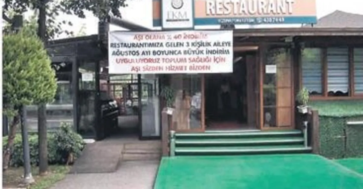 ESENLER Belediyesi Kültür Merkezi içerisinde bulunan restoran, aşı olanlara yüzde 40 indirim kampanyası başlattı. Aşı olanlar, ağustos sonuna kadar restoranda yüzde 40 indirimden yararlanabilirken, aile kampanyasından da 3 kişi faydalanabilecek. Restoran sorumlusu Uğur Acar, "Vatandaşı aşıya teşvik etmek için böyle bir uygulama başlattık. Restorana gelenler kampanyanın uzamasını istiyor. Düğünler için de bir kampanya hazırlıyoruz. Aşı olan çiftlere indirim yapmayı planlıyoruz" dedi.