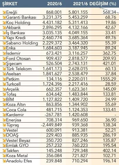 Borsada 65.2 milyar TL ile piyasa değeri en yüksek şirket olan Ereğli Demir Çelik Fabrikaları (Erdemir), kârlılıkta da bankaları geçerek zirveye oturdu. Erdemir'in net kârı, yüzde 568 artarak 5.8 milyar liraya ulaştı. Erdemir ayrıca 2020'nin tamamındaki 3.3 milyar liralık kârın neredeyse iki katına bu yılın ilk yarısında ulaştı. Erdemir yılın ilk yarısında cirosunu da yüzde 80 artırarak 24.8 milyar liraya taşıdı.