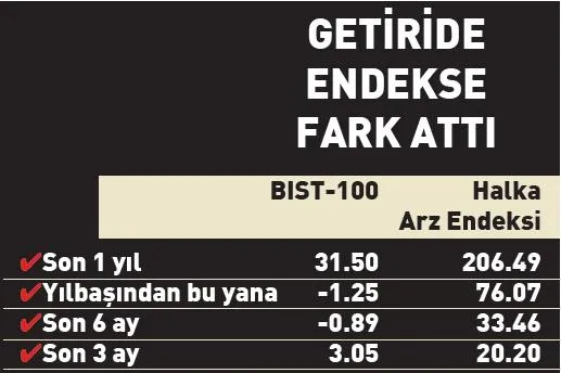Borsa İstanbul'da bu yıl şimdiye kadar 33 şirket 14.7 milyar liralık halka arz gerçekleştirirken, yeni işlem görmeye başlayan şirketler yatırımcılarını ihya etti. Borsa İstanbul'da endeksin yüzde 31.5 oranında yükseldiği son 1 yılda halka açılan hisselerin performansını ölçen Halka Arz Endeksi'ndeki artış yüzde 206'ya ulaştı. Son 1 yılda en fazla yükselen endeks olan halka arz endeksi, BIST-100'ün yüzde 1.25 değer kaybettiği 2021'de ise yüzde 76 prim yaptı.