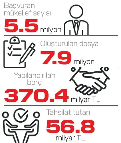 Kamuya yönelik borçların yapılandırılmasına ilişkin düzenleme kapsamında, Hazine ve Maliye Bakanlığı'na bağlı vergi dairelerine 5.5 milyon mükellef başvurdu, 370.4 milyar lira yapılandırıldı, 56.8 milyar lira tahsilat yapıldı. Vergi daireleri ve sosyal güvenlik müdürlüklerine ödenecek borçlar başta olmak üzere çok sayıda kurumun alacağının yapılandırıldığı, 'Bazı Alacakların Yeniden Yapılandırılmasına İlişkin Kanun' kapsamında başvuru süresi pazartesi günü sona erdi. Kanun kapsamında Bakanlığa bağlı vergi dairelerine 5 milyon 484 bin 289 mükellef başvurdu, 7 milyon 946 bin 460 yapılandırma dosyası oluşturuldu. Son başvuru süresi itibarıyla 370 milyar 477 milyon 406 bin 725 liralık alacak yapılandırıldı. Bu kapsamda, 56 milyar 783 milyon 48 bin 648 liralık tahsilat gerçekleşti. Cumhurbaşkanlığı Kararı ile yapılandırmaya ilişkin kanundan yararlanılmak için başvuru süresi 3 Temmuz'a, ilk taksit ödeme süresi ise 31 Temmuz'a uzatılmıştı. Kanun kapsamında yapılandırılan borçlar peşin veya taksitler halinde ödenebiliyor.