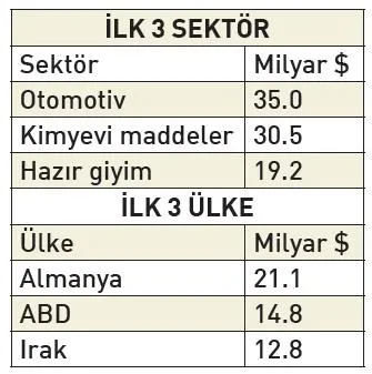 Otomotiv 35 milyar dolarla ihracat şampiyonu olurken, kimyevi maddeler 30.5 milyar dolarla ikinci, hazır giyim ve konfeksiyon 19.2 milyar dolarla üçüncü sırada yer aldı.