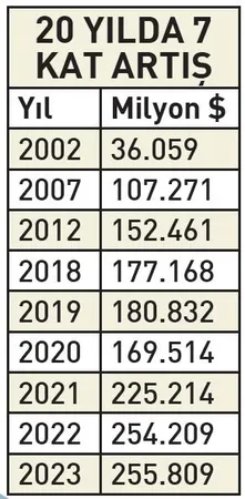 Küresel ticaretteki 2 trilyon dolarlık daralmaya rağmen Türkiye'nin ihracatındaki artış trendi 2023'te de devam etti. Türkiye, Cumhuriyetin 100. yıldönümünün kutlandığı 2023'te, 2022'ye göre yüzde 0.6 artışla 255.8 milyar dolarla ihracatta rekor kırarken, Orta Vadeli Program'daki 255 milyar doları da aştı. Türkiye'nin 2002'de yüzde 0.55, 2022'de ise yüzde 1.02 olan küresel ihracattaki payı da yüzde 1.06 ile tarihin en yüksek seviyesine çıktı. İhracatın kilogram başına fiyatı ise 1.57 dolara ulaştı. 2002'de aylık ortalama 3 milyar dolar olan ihracat, 2023'te ise 21.3 milyar dolara çıktı. Aralık ayında da 22 milyar 999 milyon dolarlık ihracat yapıldı. Böylece tarihin en yüksek aralık rakamına imza atılmış oldu.