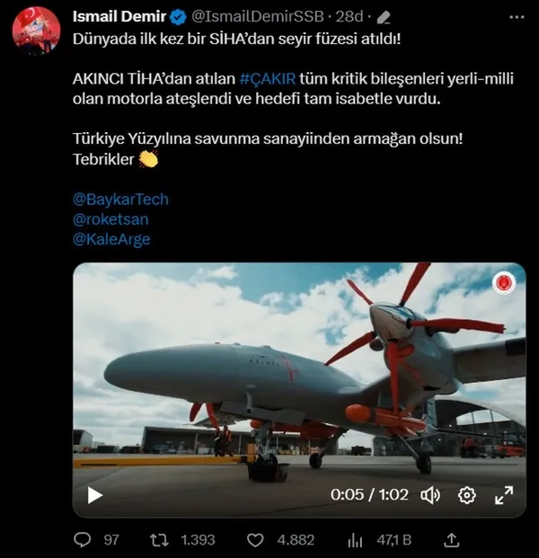 Türkiye Cumhurbaşkanlığı Savunma Sanayii Başkanı (SSB) İsmail Demir, sosyal medya platformu Twitter'daki hesabından, ÇAKIR seyir füzesi ile ilgili bir paylaşımda bulundu.
