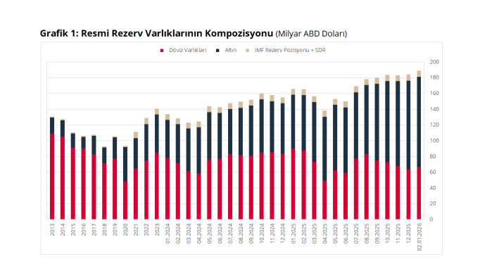 Döviz varlıkları geçen aya göre %4,6 artarak 66,8 milyar dolar, altın cinsinden rezerv varlıkları yüzde 1,9 artarak 114,5 milyar dolar oldu.