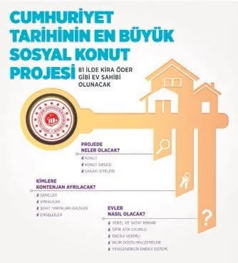 Hükümetin satılık ve kiralık ev fiyatlarında yaşanan fahiş artışlar nedeniyle mağduriyetle karşılaşan vatandaşların sorunlarını çözmek amacıyla hazırladığı, Cumhuriyet tarihinin en büyük sosyal konut projesi için geri sayım başladı. Projenin detayları önümüzdeki hafta salı günü Başkan Recep Tayyip Erdoğan tarafından Cumhurbaşkanlığı Külliyesi'nde açıklanacak. Erdoğan, dün projenin 250 bin konut, 100 bin altyapılı konut arsası içerdiğini söyledi. 81 ilde yapılacak ucuz konutlarda emekli, genç, engelli vatandaşlar için ek kontenjan ayrılacak. Vatandaşlar, yüzde 10 peşinatla, 20 yıl vadeyle ev sahibi olabilecek. Taksit miktarı da asgari ücretli çalışanların ödeme imkânına göre belirlenecek. İşte projenin detayları…