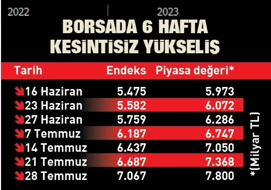 BIST-100 Endeksi yüzde 3 yükselerek 7.067 puanla kapanış rekoru kırarken, tarihi zirve 7.096'ya çıktı. İşlem hacminde de 210.4 milyar lira ile rekor kırıldı. Borsa İstanbul art arda altıncı haftayı da yükselişle kapatırken, yüzde 29 prim yaptı. Böylece endeks, seçimlerin ikinci turundan bu yana yaklaşık yüzde 55 yükselmiş oldu.