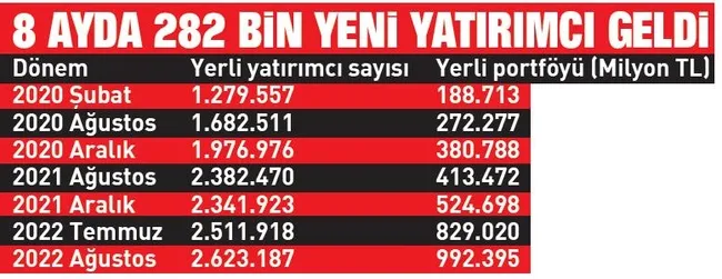 Borsanın enflasyonun üzerinde getiri sağlaması, yatırımcıların da piyasaya olan ilgisinin katlanarak devam etmesine neden oldu. Borsa İstanbul'da 2022'nin temmuz ayında 2 milyon 511 bin olan yerli yatırımcı sayısı, ağustosta 112 bin kişi artarak 2 milyon 623 bine çıktı. Yerli yatırımcı sayısı, 2021 sonuna göre ise 282 bin kişi arttı. Türkiye'de ilk korona vakasının görülmesi öncesinde borsadaki yerli yatırımcı sayısı 1 milyon 279 bin seviyesinde bulunuyordu. Yatırımcı sayısındaki artışla birlikte endeksin de rekor kırması, yerli yatırımcının borsadaki portföyünü zirveye taşıdı. Yerli yatırımcının 2021 sonunda 524.7 milyar TL olan hisse senedi portföyünün büyüklüğü, 2022'nin ağustos sonunda 992.4 milyar liraya ulaştı. Yatırımcıların borsadaki toplam hisse senedi varlığının büyüklüğü 1 trilyon 488 milyar lira seviyesinde bulunuyor. Yerli yatırımcının toplamdaki payı yüzde 67'ye ulaştı.