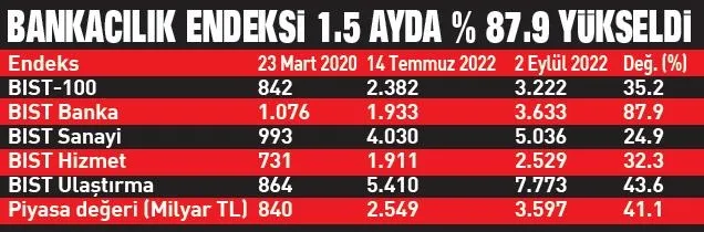 2021'in ilk 7 ayında 40.2 milyar TL olan net kârını, bu yılın aynı döneminde 207.8 milyar liraya çıkaran bankacılık sektörü, borsada son 1.5 ayda yaşanan yükselişin lokomotifi oldu. Endeksin yüzde 35 yükseldiği 14 Temmuz'dan bu yana bankacılık endeksi yüzde 87.9 prim yaptı. Bu süreçte TSKB yüzde 197, Vakıfbank yüzde 136, İş C yüzde 98, Halkbank yüzde 87, Yapı Kredi yüzde 86, Garanti yüzde 74, Akbank yüzde 63 yükseldi.
