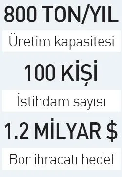 Borda katma değerli ürün dönemini başlattıklarını belirten Dönmez, şunları anlattı: "Geleneksel bor ürünlerinden ileri teknoloji bor ürünlerine geçişi temel hedef olarak belirledik. 2019'da bor karbür tesisimizin temelini atmıştık. İnşallah bu yılın sonuna doğru devreye alacağız. Bor karbür savunma sanayinde sıklıkla kullanılan bir ürün. Personel kıyafetleri ve araçların zırhlanmasında, nükleer enerjide ve aşınmaya dayalı mekanik parçaların üretiminde kritik bir bileşen. Lityum üretim tesisimiz için de kolları sıvamıştık. 2 yıl önce dünyada ilk defa sıvı bor atıklarından lityum üretimine Eskişehir Kırka'daki pilot tesisimizde başladık. Lityum üretimi Eti Maden'deki arkadaşlarımızın 3 yıllık Ar-Ge faaliyetlerinin ürünü. Yüzde 100 Eti Maden'e özgü bir yöntemle, dünyada ilk defa kullanılan bu teknik sayesinde atıklardaki bor ve lityum ayrıştırıldı. Eti Maden bu üretim yönteminin patentini almak için başvurusunu yaptı."